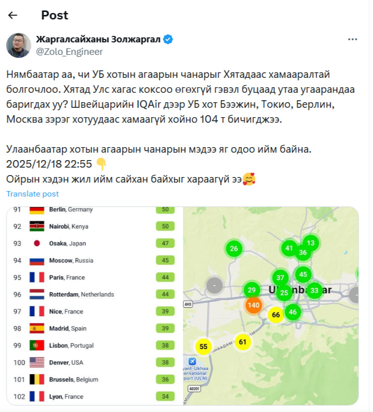 Тэрээр, “Нямбаатар аа, чи УБ хотын агаарын чанарыг Хятадаас хамааралтай болгочлоо. Хятад Улс хагас коксоо өгөхгүй гэвэл буцаад утаа угаарандаа баригдах уу? Швейцарын IQAir дээр УБ хот Бээжин, Токио, Берлин, Москва зэрэг хотуудаас хамаагүй хойно 104-т бичигджээ. Улаанбаатар хотын агаарын чанарын мэдээ яг одоо ийм байна. 2025/12/18 22:55