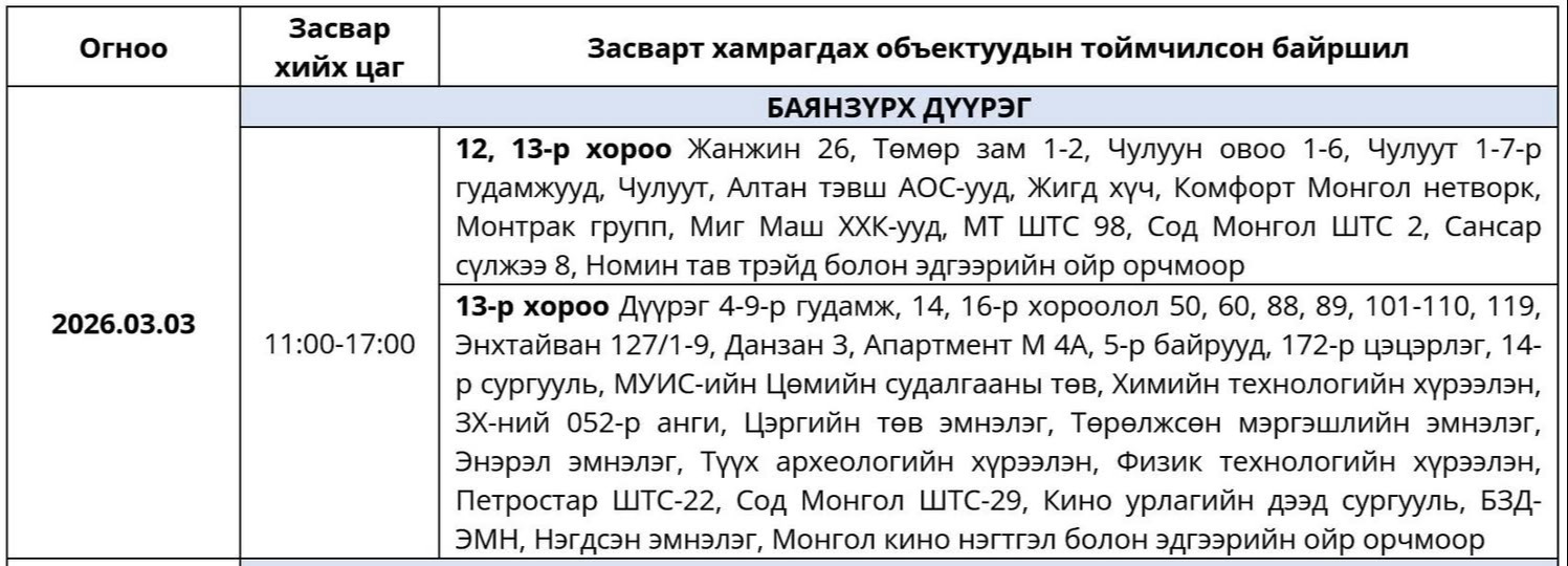 Өнөөдөр буюу 2026 оны гуравдугаар сарын 03-ны Мягмар гарагт цахилгаан шугам сүлжээнд хийх засварын хуваарийг танилцуулж байна.