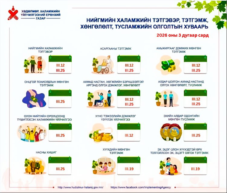 Хөдөлмөр, халамжийн үйлчилгээний ерөнхий газраас нийгмийн халамжийн тэтгэвэр, тэтгэмж, хөнгөлөлт, тусламжийн 2026 оны гуравдугаар сарын олголтын хуваарийг танилцуулж байна.