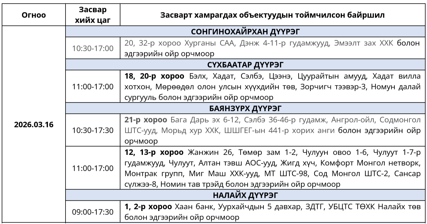 Өнөөдөр буюу 2026 оны гуравдугаар сарын 16-ны Даваа гарагт цахилгаан шугам сүлжээнд хийх засварын хуваарийг танилцуулж байна.