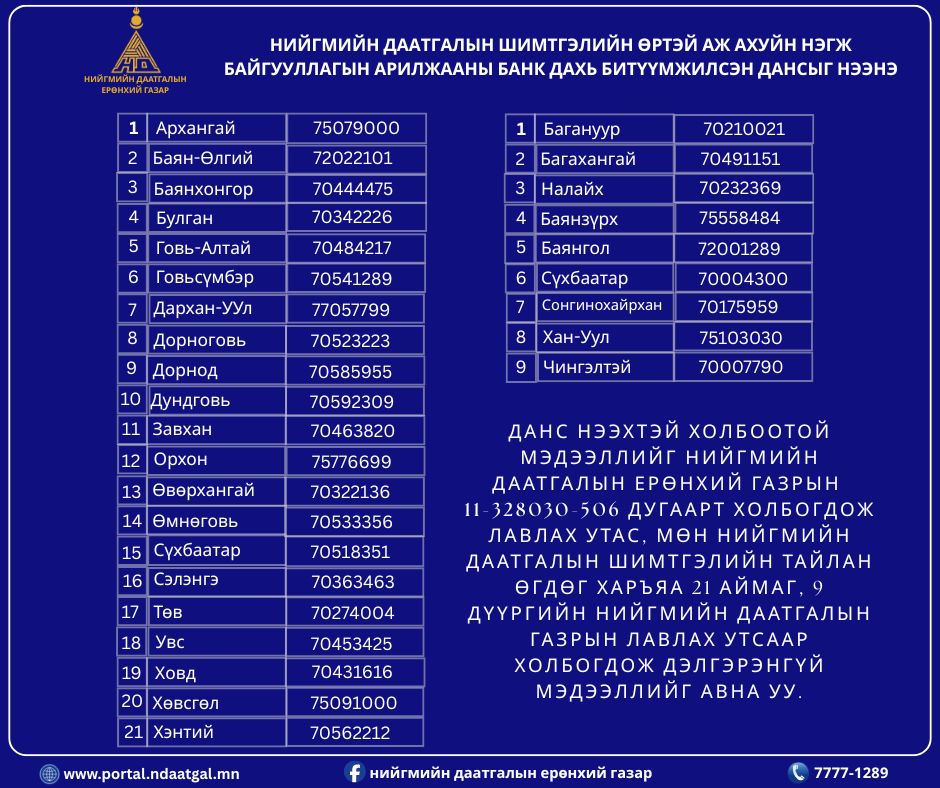 Данс нээхтэй холбоотой мэдээллийг Нийгмийн даатгалын ерөнхий газрын 11-328030-506 дугаарт холбогдож лавлах утас, мөн нийгмийн даатгалын шимтгэлийн тайлан өгдөг харъяа 21 аймаг, 9 дүүргийн Нийгмийн даатгалын газрын лавлах утсаар холбогдож дэлгэрэнгүй мэдээллийг авна уу.