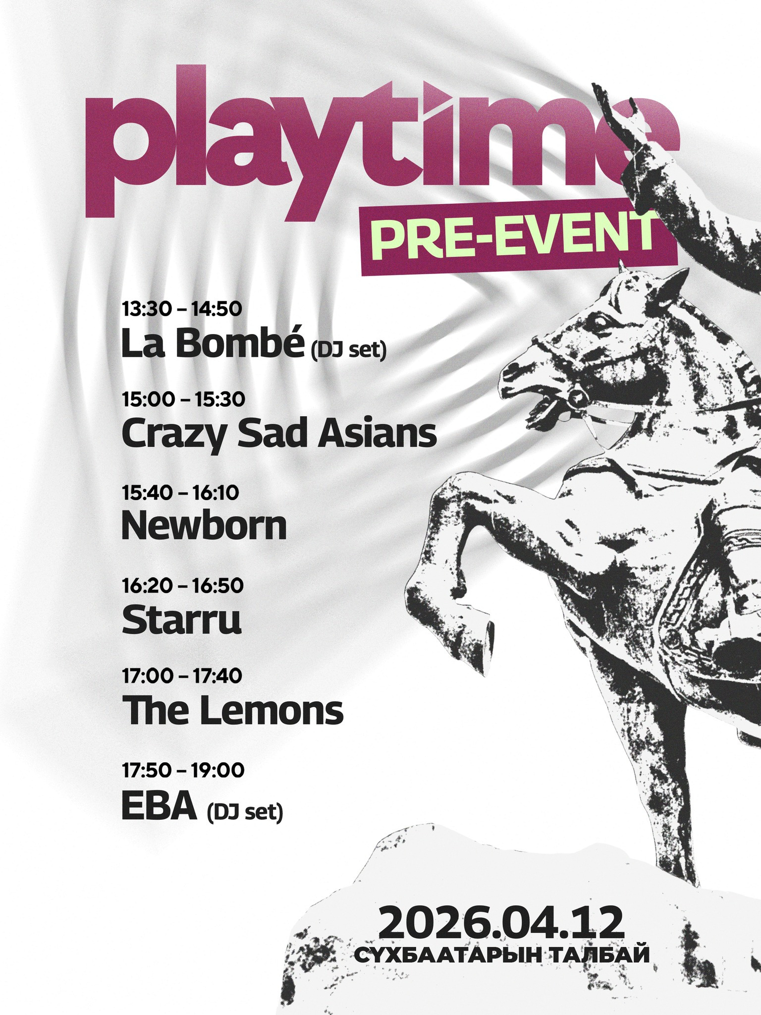 “Playtime” олон улсын хөгжмийн наадам 21 дэх жилийн ойгоо ирэх долоодугаар сарын 2-4-ний өдрүүдэд зохион байгуулахаар болсон. Тэгвэл “Playtime” наадмын энэ жилийн эхний “Pre-event”-ийг энэ ням гарагт буюу дөрөвдүгээр сарын 12-нд Жанжин Д.Сүхбаатарын талбайд зохион байгуулах гэж байна. Уг арга хэмжээнд дараах уран бүтээлчид уран бүтээлээ толилуулна. Тодруулбал,