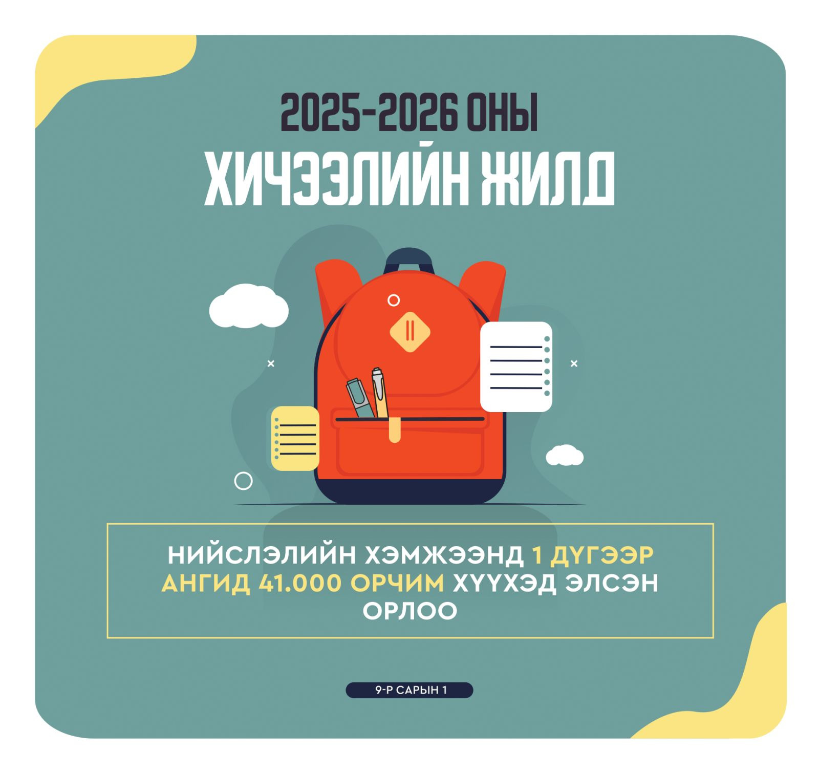 Үүнээс 1 дүгээр ангид 41.000 орчим хүүхэд элсэн суралцаж байна. Боловсрол, шинжлэх ухааны сайдын 2023 оны А/350, А/398 дугаар тушаалуудаар баталсан сургалтын төлөвлөгөөний дагуу Ерөнхий боловсролын сургуулийн сургалтын үйл ажиллагаа 34-37 долоо хоног үргэлжилнэ.