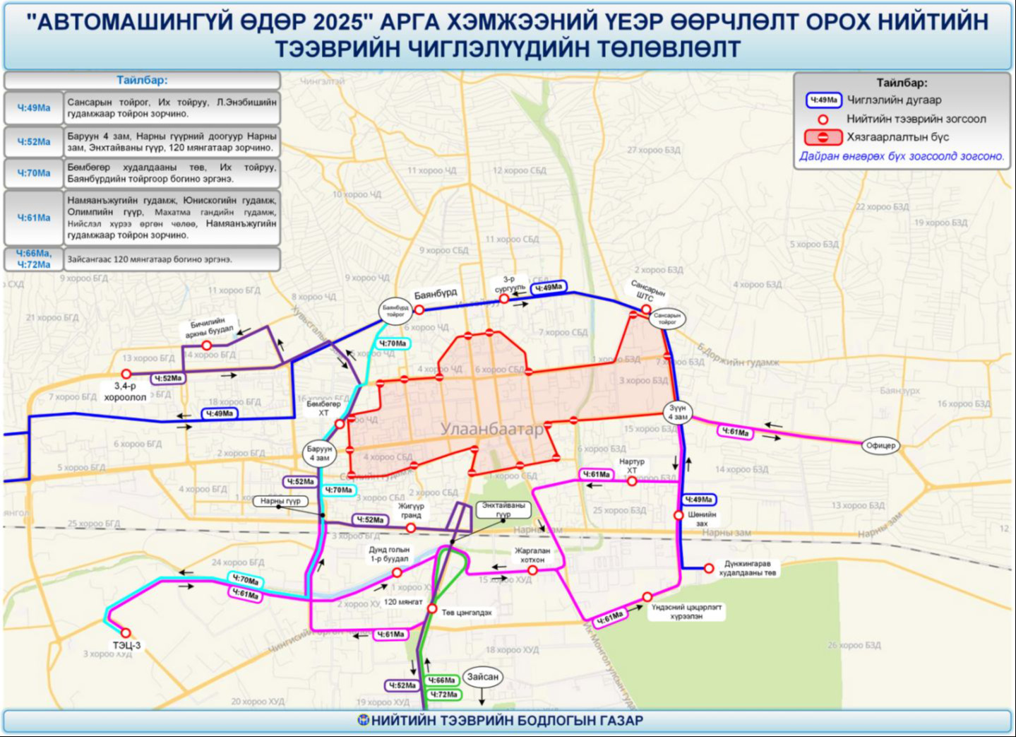 2025 оны есдүгээр сарын 13-ны өдөр зохион байгуулагдах "Автомашингүй өдөр 2025" арга хэмжээний үеэр төв замын хөдөлгөөнийг хаах тул нийтийн тээврийн 43 чиглэлийн 459 автобусны маршрутад 07:00-18:00 цагийн хооронд өөрчлөлт орно.