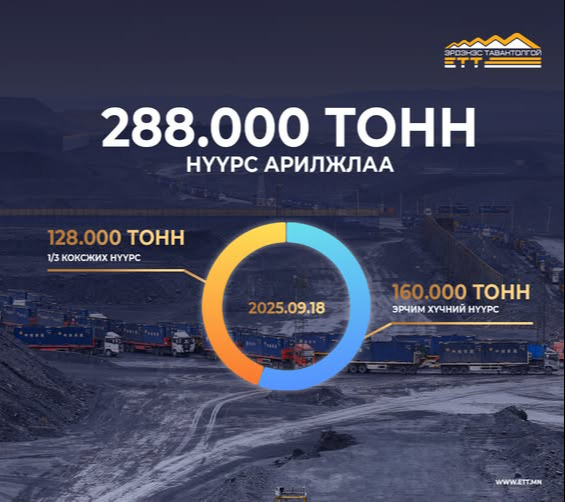 "Эрдэнэс Тавантолгой" ХК 2025 оны 9 дүгээр сарын 18-ны өдөр Монголын Хөрөнгийн Биржээр дамжуулан 3 удаагийн арилжааг амжилттай хийж 6.6 сая ам.долларын үнийн дүн бүхий 160.0 мянган тонн эрчим хүчний нүүрс, 8.7 сая ам.долларын үнэлгээ бүхий 128.0 мянган тонн 1/3 коксжих нүүрс борлууллаа.
