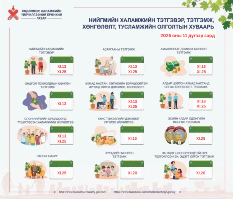 - Онцгой тохиолдлын мөнгөн тэтгэмж, ахмад настан, хөгжлийн бэрхшээлтэй иргэн, өрх толгойлсон эх, эцэгт олгох тэтгэмжүүд, хүнс тэжээлийн дэмжлэгийн хөтөлбөрийн мөнгийг арваннэгдүгээр сарын 13-нд,