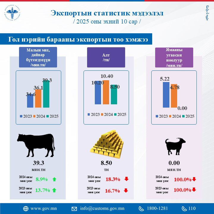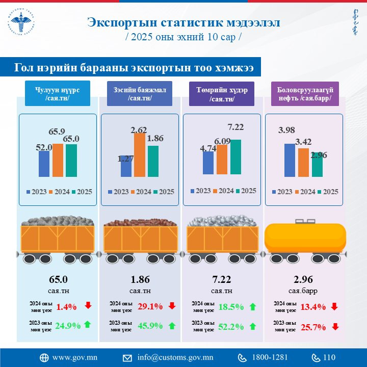 2025 оны эхний 10 сард экспортолсон хар тугалганы хүдэр болон баяжмал, төмрийн хүдэр, цайрын баяжмал, түүхий нефть, чулуун нүүрсийг 100.0 хувь БНХАУ-д, зэсийн баяжмал, хүрэн нүүрсний 99.9 хувийг БНХАУ-д, самнасан ноолуурын 82.9 хувийг БНХАУ-д тус тус экспортолж дээрхи нэрийн бараа нь экспортын нийт дүнгийн 81.7 хувийг эзлэж байна.