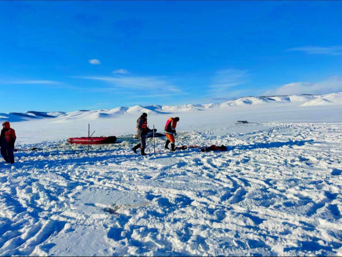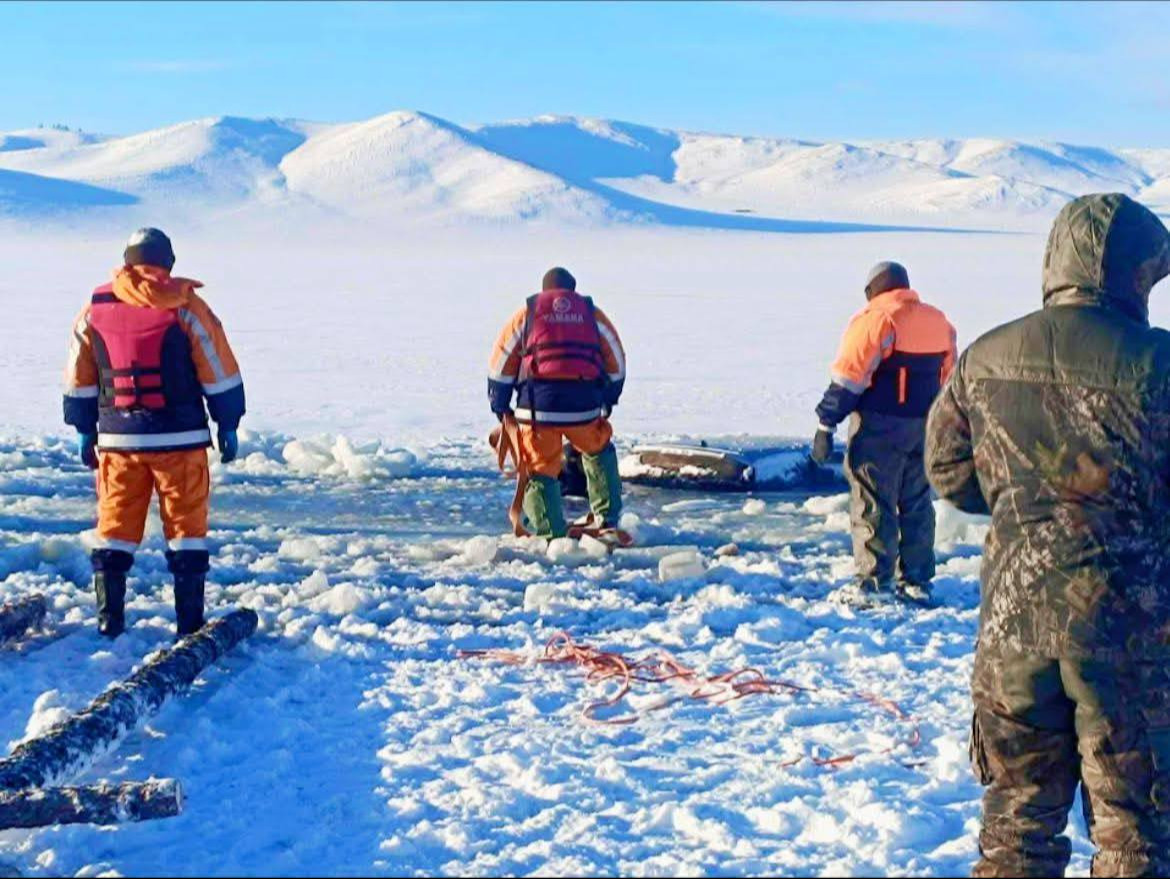 Нуурын эргээс 280 орчим метрийн зайд “Тоёота пробокс” загварын суудлын цөмөрсөн байгааг татан гаргахаар ажилласан боловч нуурын мөс хэт нимгэн байгаа тул татан гаргах ажиллагааг түр зогсоогоод байна.