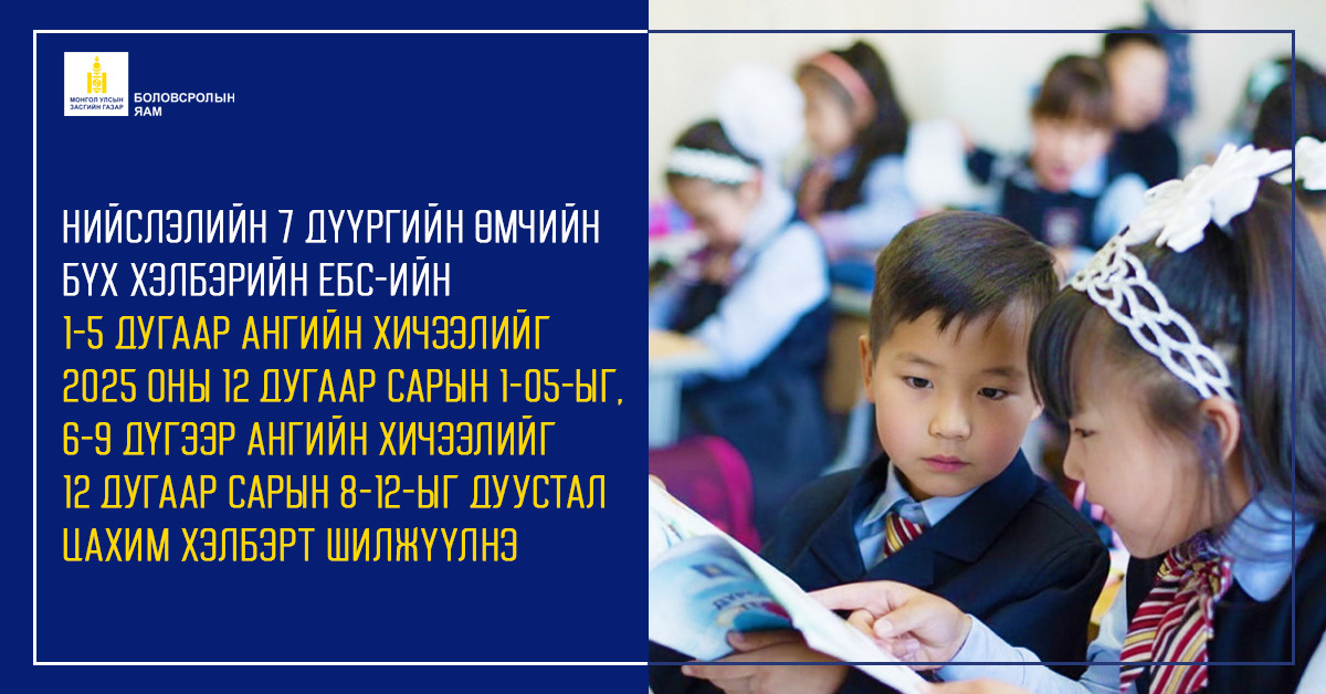 Жич: Бага, дунд ангийн хичээл цахим долоо хоногийн хугацаа дуусмагц “2025-2026 оны хичээлийн жилийн бүтэц”- ийн дагуу амралтын улирал эхэлтэл танхимаар явагдах юм.