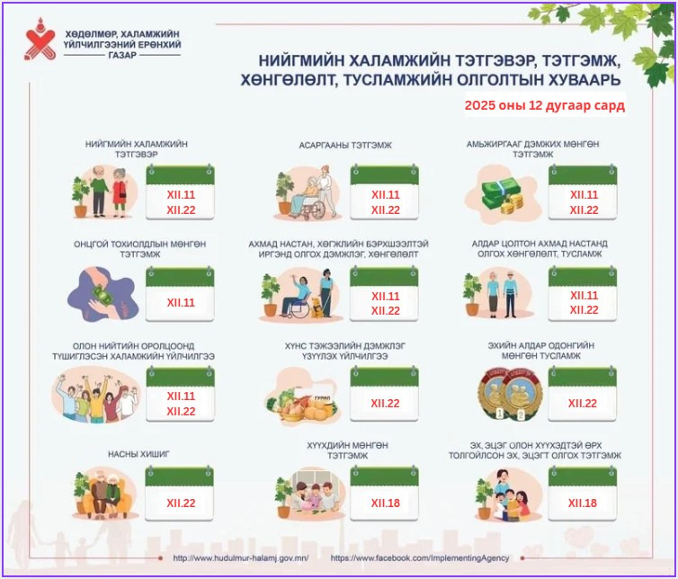 Хөдөлмөр, халамжийн үйлчилгээний ерөнхий газраас 2025 оны арванхоёрдугаар нийгмийн халамжийн тэтгэвэр, тэтгэмж, халамж, хүүхдийн мөнгө олгох хуваарийг танилцууллаа. Энэ сард: